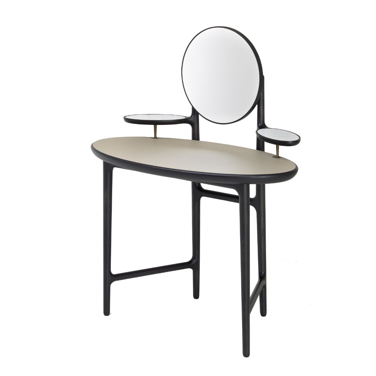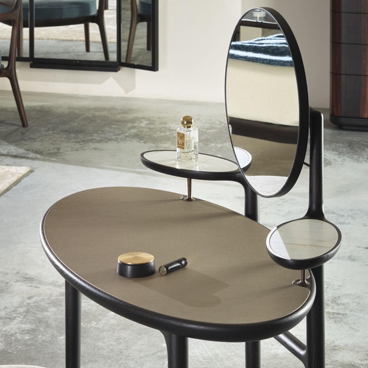 Tömör kőrisfa váza egy elegáns, ellipszis alakú tetejet tart, amelyet két kis oldalsó polc gazdagít, választhatóan festett üveg vagy kalacatta márvány felülettel. Középen, a két oldalsó teteje között egy nagyméretű, függőlegesen állítható szögű elülső tükör található. A teteje, amely bőr vagy festett üveg kivitelben kapható, egy síkban lesz a tömör kőrisfa kerettel. A tömör sárgaréz alkatrészek, mint például a távtartók és a tükörállító mechanizmus, értékes részletek, amelyeket gondosan terveztek, hogy fokozzák a tárgy egyediségét. A DUO Vanity több mint egy bútordarab: minden elem hozzájárul ahhoz, hogy az elegancia és a kifinomultság igazi ékszerévé váljon, amely a szépségnek és a mindennapi jólétnek szenteli magát.