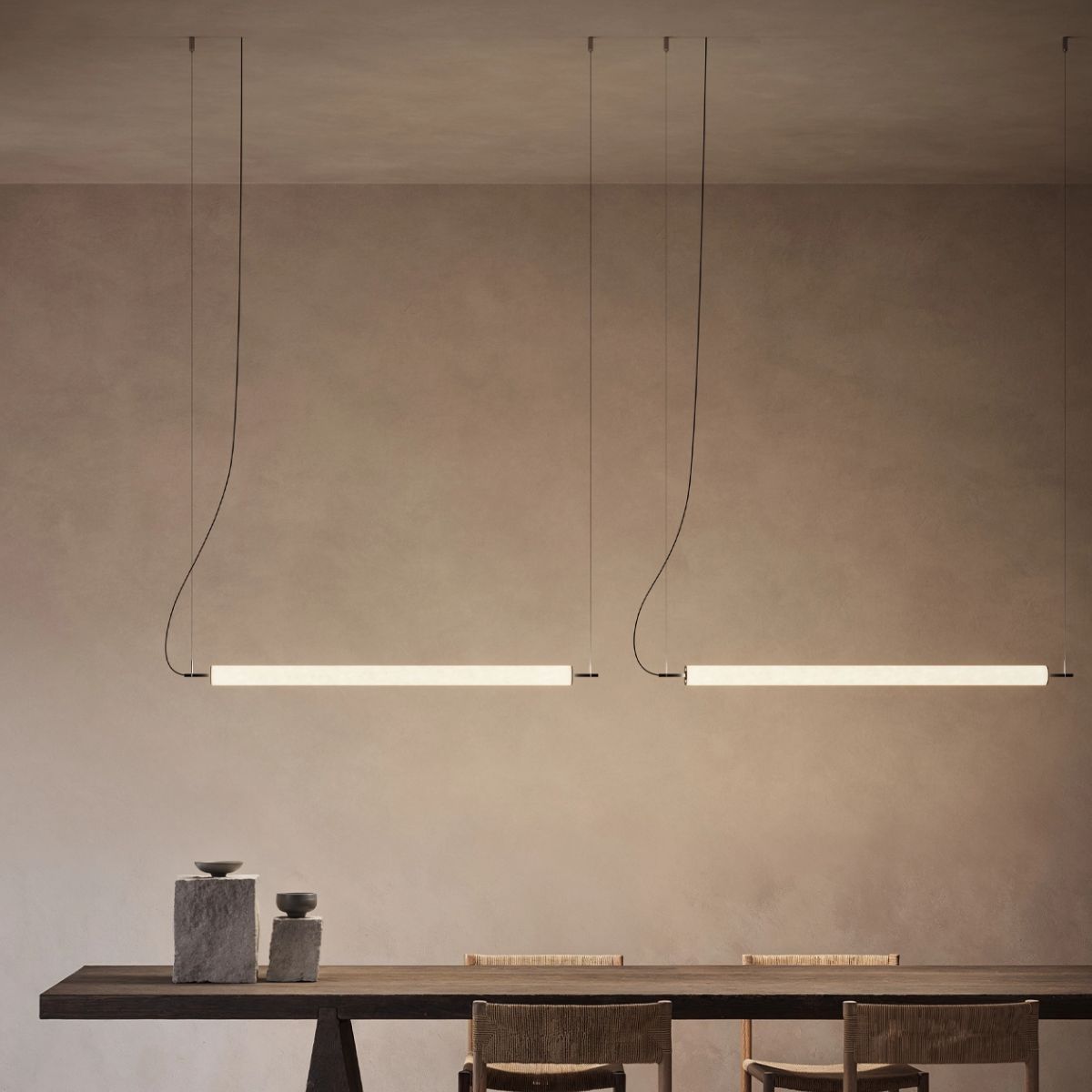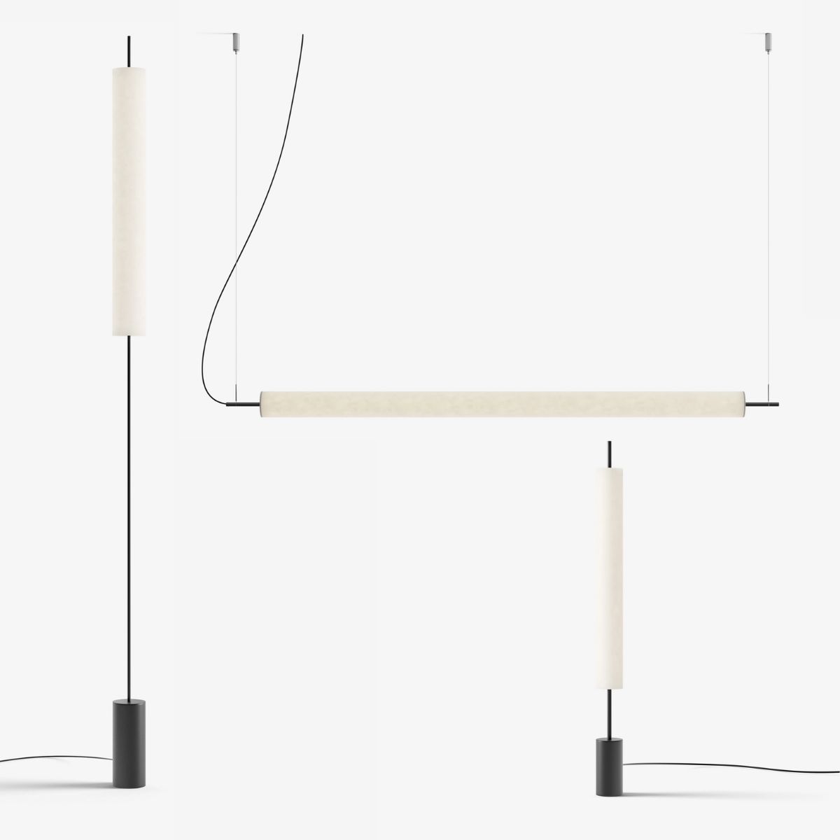 Méretek: Állólámpa: talp Ø 8 cm x magasság 162 cm Asztali lámpa: talp Ø 5 cm x magasság 57 cm Függőlámpa: hossz 108 x magasság min. 175 - max. 235 cm